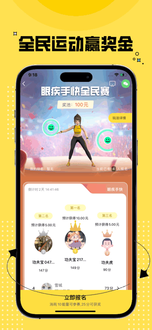 无论年龄、性别、运动能力如何,所有人都可以在功夫链找到适合自己的运动游戏!这些游戏既简单,又无需任何运动技巧,不仅非常好玩,还有来自世界各地的爱好者和你一起挑战,让运动变得好玩,让运动不再独自承受
