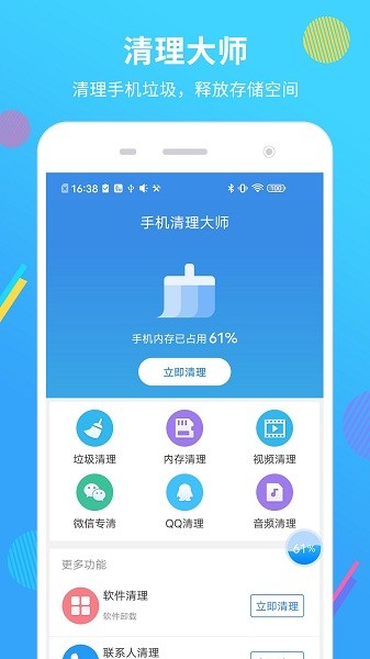 1、轻量级应用,简约之上,手机清理大师专注为您的手机清理加速。