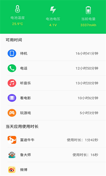 1、用户可以通过软件看到手机屏幕的开关时间,看到电池温度、电压等信息。