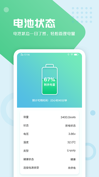 首先,这个软件可以实时监测电池的状态,告诉我电池的真实健康度,还能显示当前电量剩余量。最让我喜欢的是它的“一键智能省电”功能,轻轻一点就能清理掉那些偷偷消耗电量的后台应用,特别适合那些总在 background运行各种程序的人。