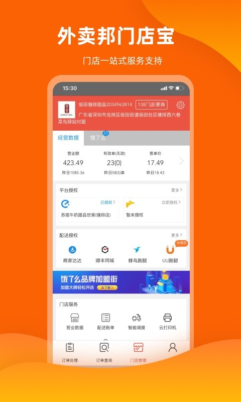 外卖邦门店宝,专为门店打造的管理软件,外卖店铺可以使用智慧化监控自己的日常销售状况,实时处理客户的订单信息,软件集成数据分析与订单管理等功能于一体,可以大大提升店铺运营效率,有需要的用户可以下载使用!