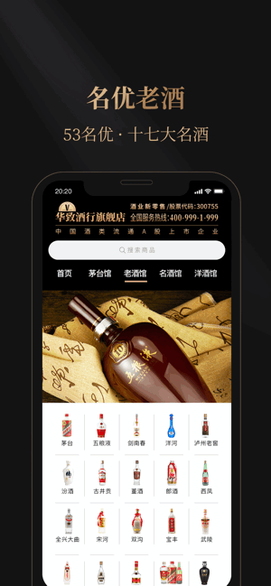 华致优选APP特设四大酒馆-茅台馆,老酒馆,名酒馆和洋酒馆,一站式满足用户对各式茅台,老茅台,五粮液,铁盖钓鱼台,荷花,拉菲,奔富,日本威士忌等千余款全球酒水的购酒需求,为用户提供“有温度”的服务。