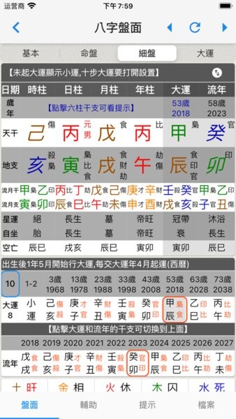 强大实用的细盘功能,大运和流年互相关联,点击大运流年可以互动大运未起以小运代替,小运和流年互相关联;