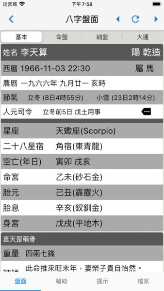 论八字排盘软件免费版是一个计算八字的算命软体。根据输入的西历或农历时间, 排出命主的八字资讯, 大运, 小运, 流年, 空亡, 胎息, 胎元, 命宫及五行信息等;细盘功能(四柱, 当前大运, 流年盘);二十八宿信息。