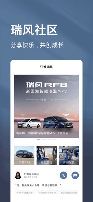 江淮瑞风App提供远程车控、一键维保、事故救援、一键家桩等便捷服务,让您智能用车。