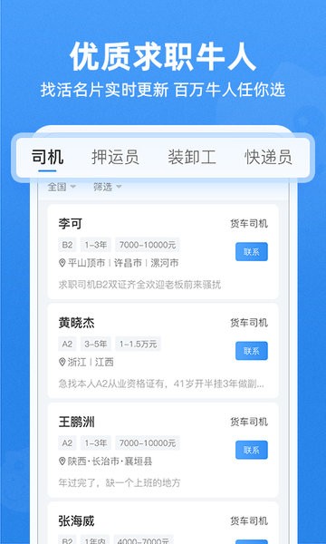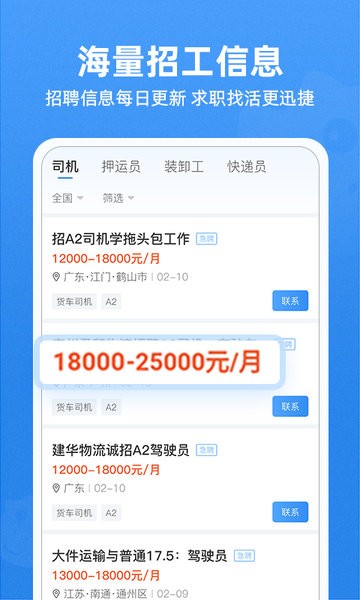 高效找活:每日更新万条司机、押运员、装卸工、快递员招工信息,求职者可筛选联系,也可发布找活名片曝光,提高找活效率