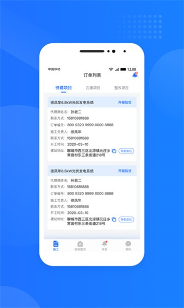 2、施工人员线上接单,施工信息实时查收;