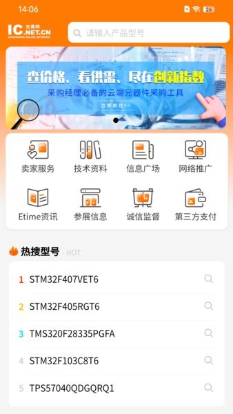 ic交易网平台是一款提供电子元器件交易的应用软件,带来卖家服务、技术资料、信息广场、网络推广、参展信息、Etime资讯、诚信监督等功能服务,随时在线搜索查询产品型号,了解创新指数,让采购交易更加方便简单!