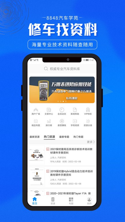 8848汽车学苑维修资料库是一个非常实用的汽修学习平台,里面收录了海量的专业技术资料,包括维修手册、电路图、故障代码、改装教程等等,基本上你想学什么都能找到。这个软件的功能挺强大的,支持手机APP、电脑版和微信等多个端口登录,资源全网通用,用起来很方便。