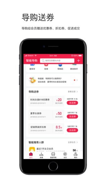 店+智能导购 - 让零售更智能是由店家科技打造的移动导购系统,软件整合了日常导购需要使用到的所有功能,无论是会员管理,还是库存管理,都可以很好的解决;同时还可以给会员送各种优惠券,保证会员用户的留存。