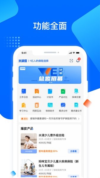 水滴保险家app是专为保险经纪人打造的办公软件,为用户带来更多的保险产品,让用户可以面对不同的客户介绍不一样的保险产品,还有许多全面的办公功能让用户轻松办公。