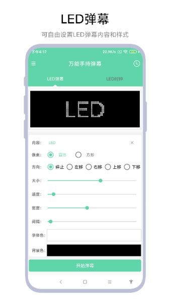 一款手持LED弹幕工具APP,可以自由设置弹幕内容、弹幕颜色、字体大小、移动方向、像素大小、双击即可快速退出等。另外,内置LED时钟,可以实现全屏显示。所有弹幕样式均可自由保存和再编辑,方便使用。