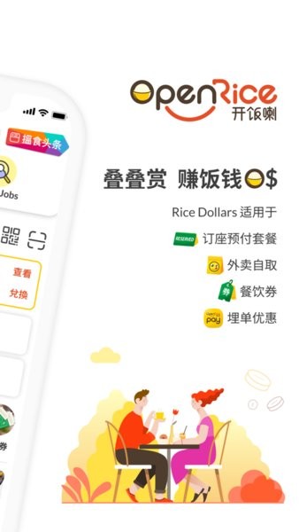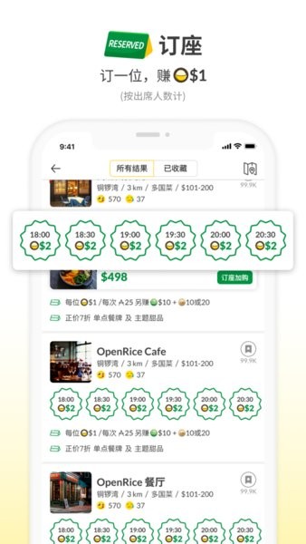 搜寻餐厅、于你喜爱的餐厅订座,出席后赚Rice Dollars当钱使!出席订座后,每位可赚$1(受条款及细则约束)。 Rice Dollars当钱使适用于外卖自取、餐饮券、订座预付套餐及OpenRice Pay埋单比钱。