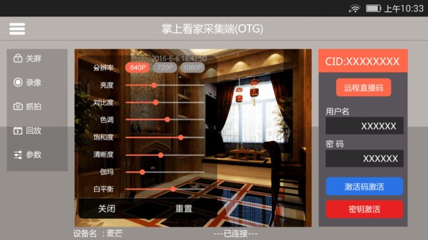 掌上看家采集端otg端是搭配连接摄像机设备的视频监控采集管理软件,可以实时进行录像、拍照,自由调整,灵活控制,一键抓拍,设置相关参数,还支持视频回放、智能报警、语音通话、上传至云端等功能,随时轻松观看,全方位监控看家!