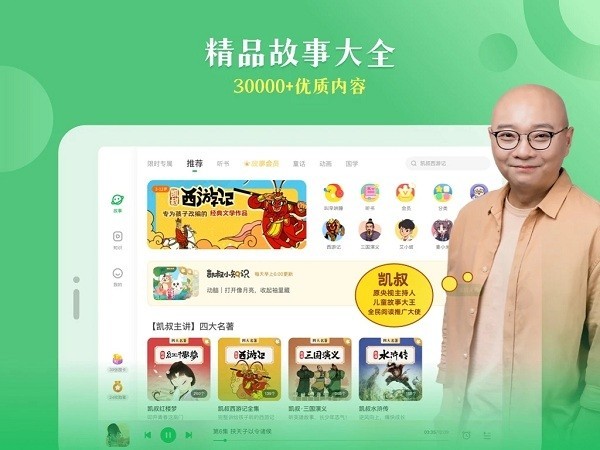 凯叔讲故事hd版app作为安卓平板的儿童讲故事软件,涵盖丰富的故事内容,海量正版授权,精选国学作品学习,还有凯叔原创故事,科学科普等内容推荐,支持在线听书,让孩子们学习更多知识,寓教于乐,助力大家成长进步,打好国学根基,培养孩子们的能力!