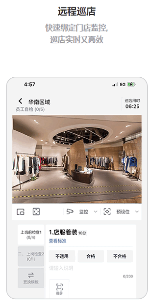 通过云台摄像头远程查看门店实时情况,每个评分项都支持截屏记录不合格场景并添加说明,减少成本,提高巡检频次和效率。