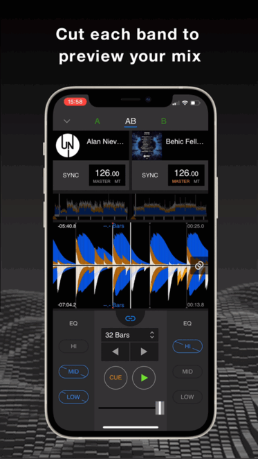 混音是DJ的生命尝试将2首曲目自然地混合成1首曲目吧首先进行BEAT SYNC,匹配好节奏和节拍后即完成准备使用SMART FADER,尝试轻松自然地进行混音吧