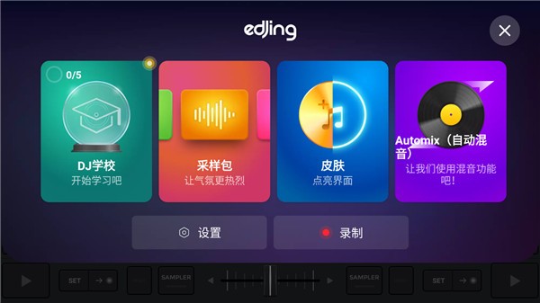 1、打开在本站下载的edjing Mix,点击进入主页,我们可以看到转盘视图中拥有非常丰富的音乐制作功能,首先我们先点击菜单;可以看到拥有dj学校、采样包、皮肤、自定混音、设置等等功能;