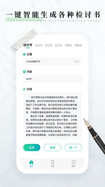 你可以输入关键字一键智能生成道歉信、检讨书等,支持复制,编辑,分享转发,语句通顺。其中内涵大量文章素材,支持一键搜索素材。