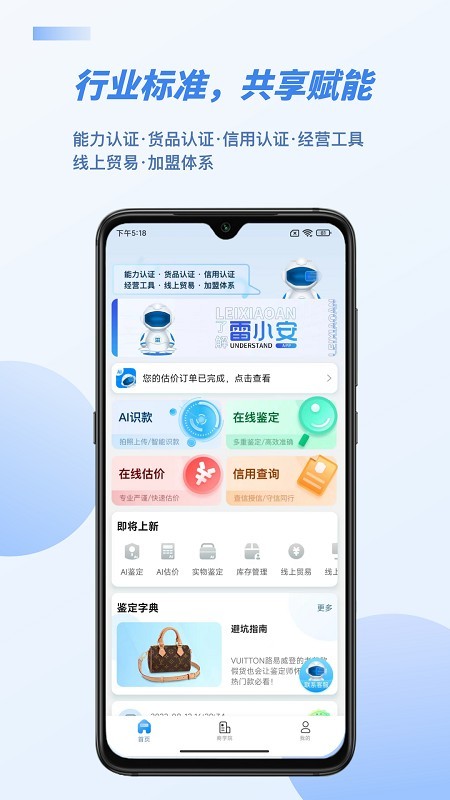 雷小安是基于二奢龙头企业安洁利集团十四年的发展沉淀,通过打造AI、SAAS工具、小安商学院和超级仓等一系列线上服务,集从业人才能力认证・货品认证・信用认证・全方位经营工具・同行线上贸易・加盟体系于一体的app。