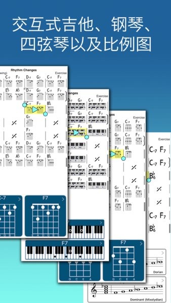 在音色逼真的钢琴(或吉他)、贝司和鼓的伴奏下,练习任何下载的或用户自行创建的和弦图表。