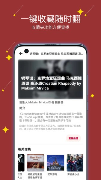 2、一键收藏,众多曲谱都可以一键搜索找到,能够在这里看到新的曲谱内容学习了。