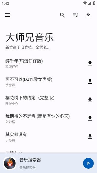 大师兄音乐2025最新版是基于音乐搜索器app制作的,同样是一个免费音乐歌曲下载app,可以下载无损音乐,也支持在线听歌。自从歌词适配和lxmusic不能用了以后,免费听歌软件是越来越少了,这个新上线的大师兄音乐大家要珍惜啊!