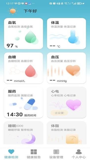 超思健康最新版是一款搭配智能设备监测使用的健康管理软件,可以随时用来测量血氧、体温、血糖、血压,数据变化趋势走向一目了然,还提供服药记录提醒,心电、睡眠、体脂情况也一手掌握,一键生成健康报告,统计分析,设备管理十分方便。守护您的健康!