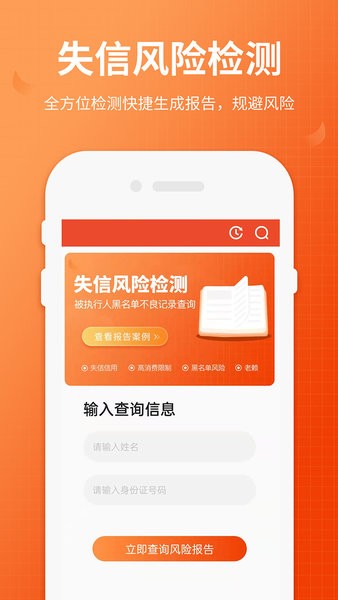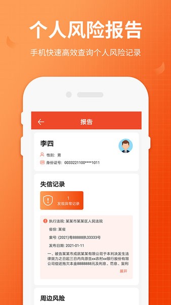 全国法院失信人查询app可以在手机上查询被法院执行的失信人名单,帮助用户辨别老赖,还可以查看企业信用记录,提供专业信用查询服务,快来试试吧!