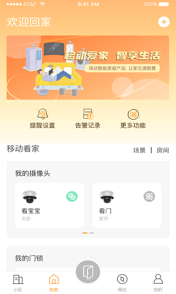 移动爱家给您带来三方面的服务体验:小区服务通过人脸开门/一键开门、在线缴费、报事报修、小区监控、联系管家等带给您安全&智能的社区生活体验。家庭服务通过智能家居设备绑定、安防托管、短信告警服务、家庭视频等开启智能家居生活第一步。周边服务通过会员卡、优惠券、本地生鲜、爱心助农等模块打造便捷生活圈。