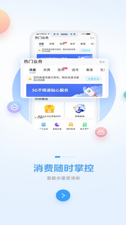 话费、流量、余额、账单等随时查,流量包、大流量套餐、宽带等一键办理。