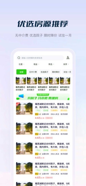 庄家共享农庄最新版是提供农庄房源租赁服务的应用平台,超多优惠房源,精选优质农宅,位置优越,可以在线查询,一键求租,无中介费,随时降价处理,院落详情信息清晰介绍,实时查看,自由交易,租赁合法合规,轻松签约,安心入住,方便省心!