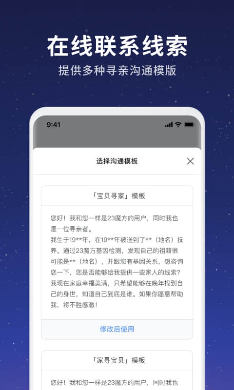 -告别高成本见面会,通过App在线联系已知线索,亲缘关系可及时确认。