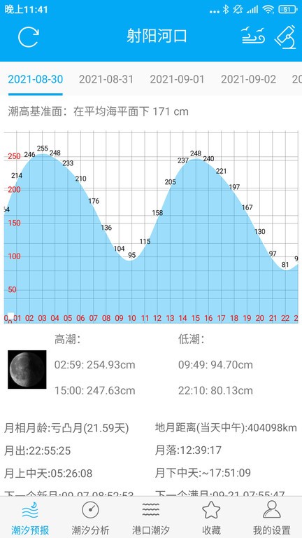 月相潮汐表app最新版可以查看潮汐预报信息,有非常详细的超潮汐分析,能显示经纬度,可以收藏站点和港口,支持按照地图来查看详细的港口潮汐预报,月相列表、月潮间隔等一目了然,可以查看当天以及未来几天的曲线变化图。