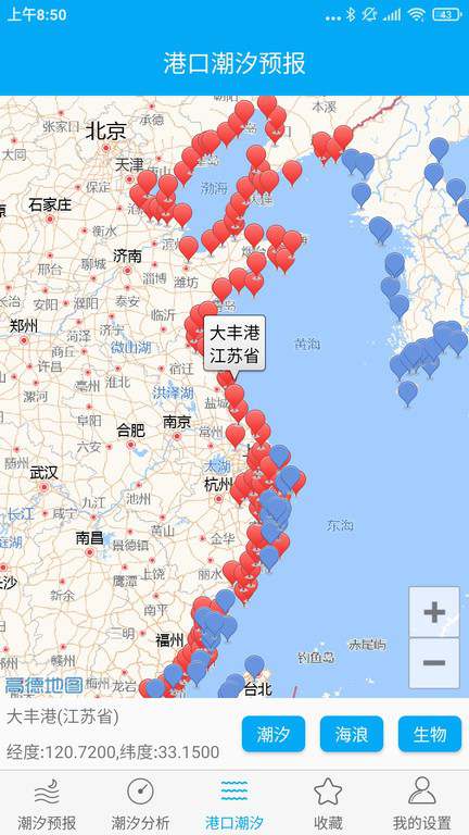 点击进入港口潮汐页面,可以点击地图上每个定位的位置,查看该定位的低潮和高潮的高度,以及水温和风向
