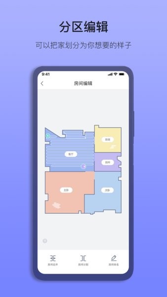 [分区编辑]机器人自动分区后,手动对分区进行编辑,可合并、分割、命名。