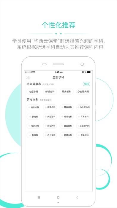 学员使用"华西云课堂APP"时选择感兴趣的学科,系统根据所选学科自动为其推荐课程内容