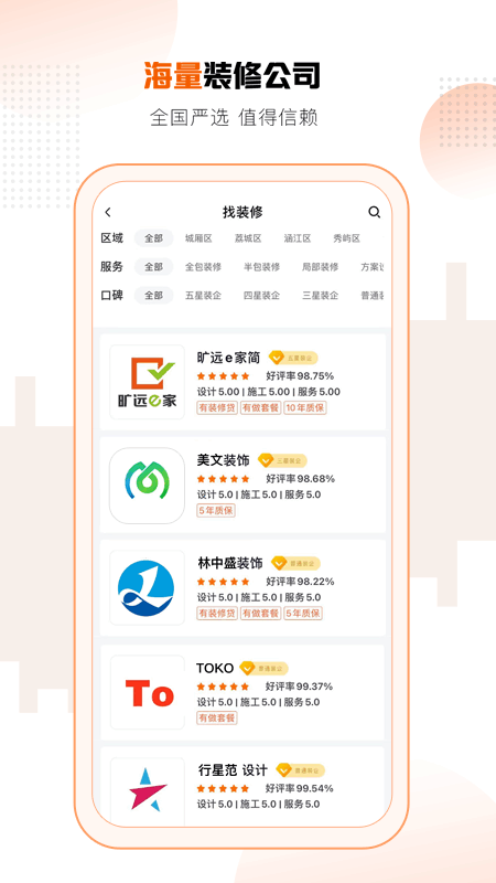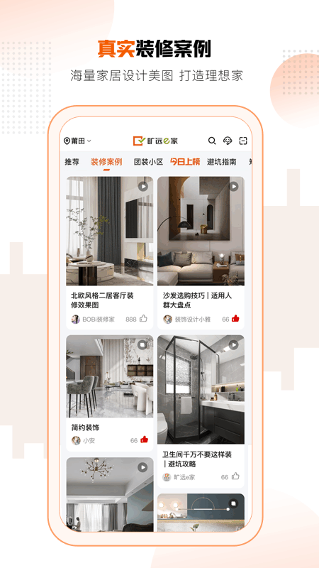 旷远e家手机版是提供家装服务的应用app,严选海量装修公司选择,24小时在线工地直播,全程监管,还提供真实装修案例查看,帮你设计美图,寻找灵感来源,还带来标准化验收方案,平台帮验收,合格再付款更加放心,省时又省力!