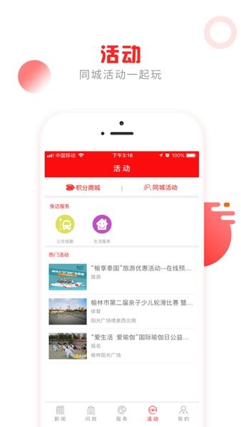 榆林发布百姓问政app不仅为百姓提供了新闻和问政服务,还提供了各种生活服务,包括天气、日历、火车票汽车票、空气质量、航班的查询,能查公交和违章,可以查看最新的活动信息,支持报名参加自己感兴趣的活动,能在线进行爆料!