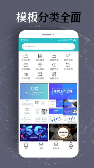 APP包含各类漂亮实用PPT/工作总结/公司介绍/产品发布/教育培训/毕业答辩等等,使用简单,文字直接点击即可修改,图片右键替换,操作简单便捷。