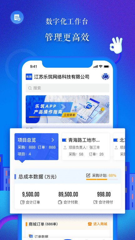 乐筑app建筑业数字化服务平台能够在把手机上进行项目总览,采购、项目数量以及订单数一目了然,成本数据非常之详细,可以查看自己的交易信息,提供了设备、人才以及物资服务,能够查看最新的建筑资讯。