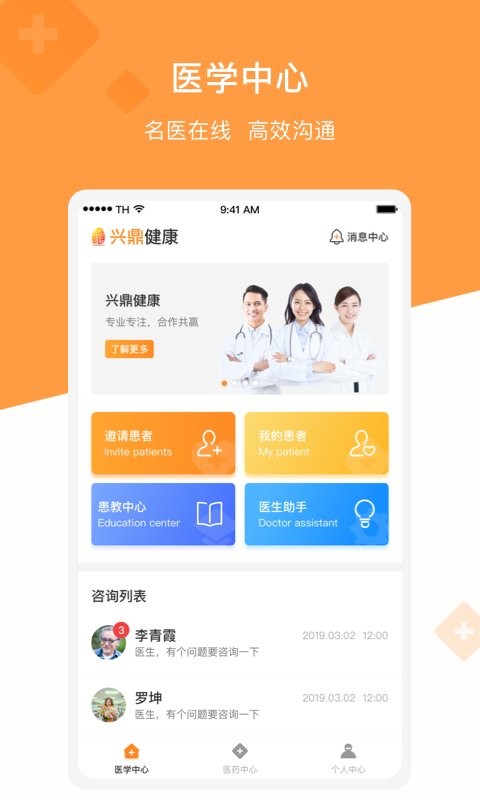 兴鼎健康手机版是专为医生群体打造的在线问诊平台,在这里可以随时查看患者的咨询,线上就能为他们答疑解惑,软件内还有专门的医药中心版块,包含了详细的药品分类,可以直接按照类别来搜索查找相关的药品,电子开单更便捷。