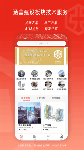 涵盖工程行业全领域技术服务,专业人员常常面临信息不全和工具不专业的问题,尤其是在施工投标方案、专项施工方案、设计投标方案、专项设计方案、视觉三维服务、施工专家评审、设计专家评审、工程造价服务等交易资源缺乏、行业资讯获取,以及目标公司的资质信息不对称等问题。市面上目前并没有一款专门针对工程行业且功能齐全的专业平台,在此环境下,弘建通应运而生。并为工程师提供技术交流与就业的技术平台。