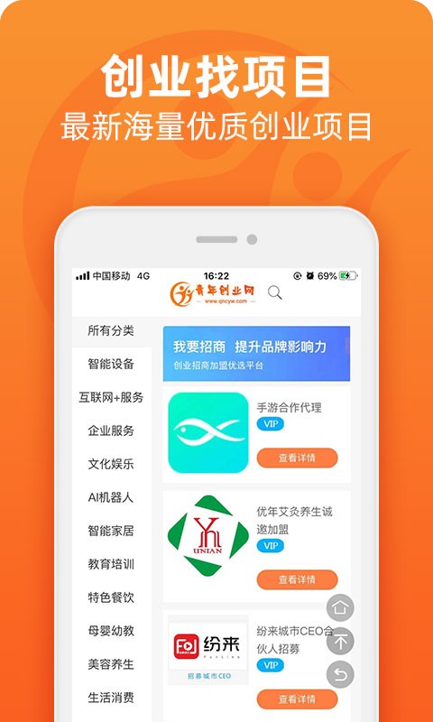 青年创业网官方版是一款提供创业服务的应用软件,面向所有的青年创业者,提供实时的创业资讯,紧跟科技创业时代前沿,特色餐饮、智能家居、互联网+、生活服务等一网打尽,带来海量优质创业项目,更有创业活动可以参与,帮助青年创业者轻松创业!
