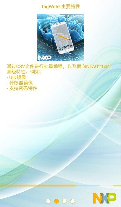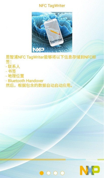 nfc tagwriter by nxp apk的NFC TagWriter可以将联系人、书签、地理位置、蓝牙转接、短信、邮件、文本信息等存储到任何支持NFC的标签上,也可以存储到海报、名片、手表等含有NFC功能的电子产品上。一旦数据被存储,该应用程序还允许读取和查看编程数据,包括根据数据自动启动应用程序的选项。
