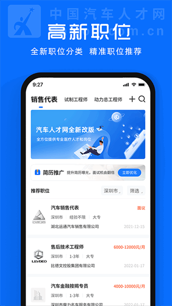中国汽车人才网,专门面向全国的汽车人才提供更好职业机会的免费APP。海量高薪职位实时更新,精准推荐好职位,找工作更专业,求职更快捷。自2002年创立以来,中国汽车人才网已吸引近100万名汽车人才进行全国性的交流,超过12000家汽车企业通过中国汽车人才网进行招聘,同时积累了丰富的经验和专业知识,成为全国知名、成长快速的汽车行业相关人才信息交流平台。