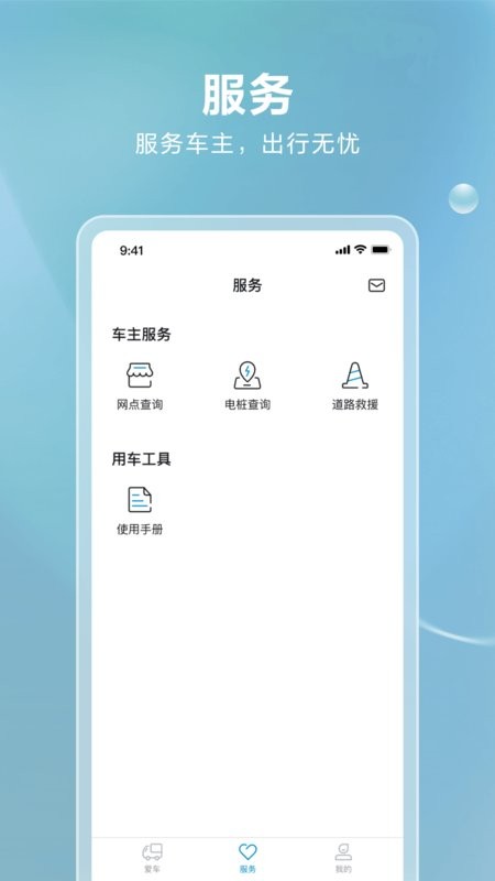 查找售后服务站、查找附近充电桩、呼叫道路救援、查看车辆使用手册
