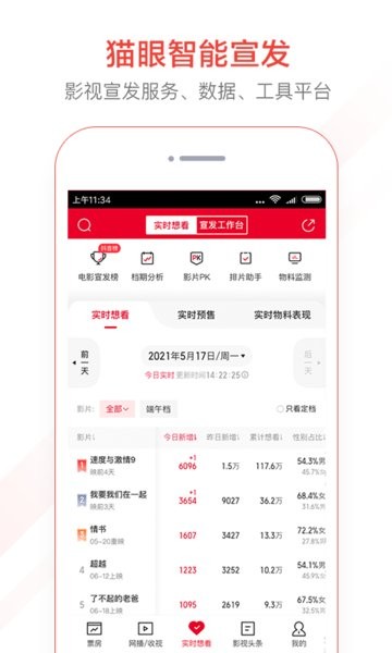 猫眼专业版实时票房是让专门从事影视行业的用户更加方便关注票房的软件,帮助用户随时查看实时的票房,还可以查看各个电影的热度,让用户可以掌握更多的影视热点。