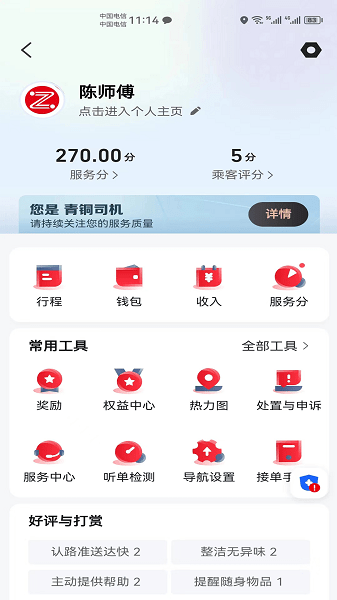 软件中将用户出车时长、星级评价、完成单量等多项数据信息进行了详细记录展示