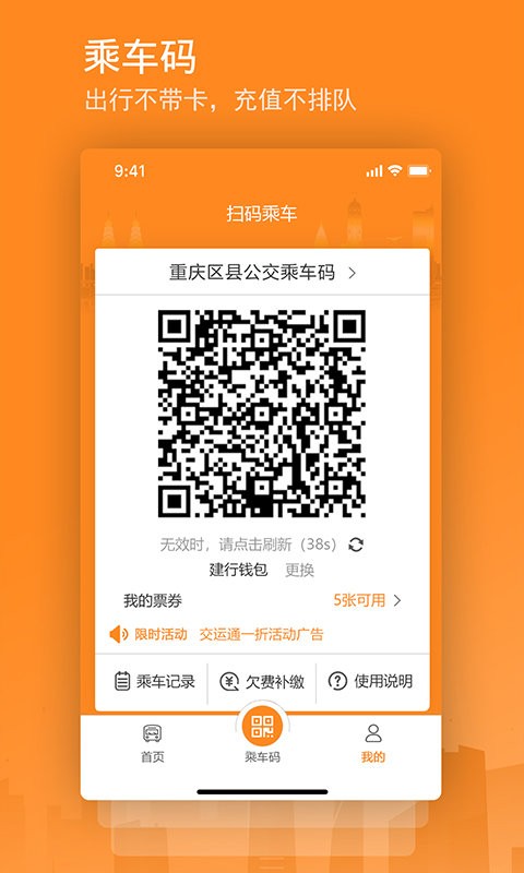 公共交通乘车二维码,可乘坐公交、出租、重庆两江游客轮、汽车票支付。